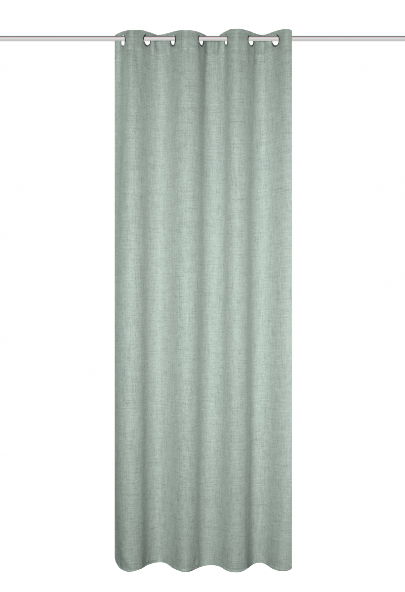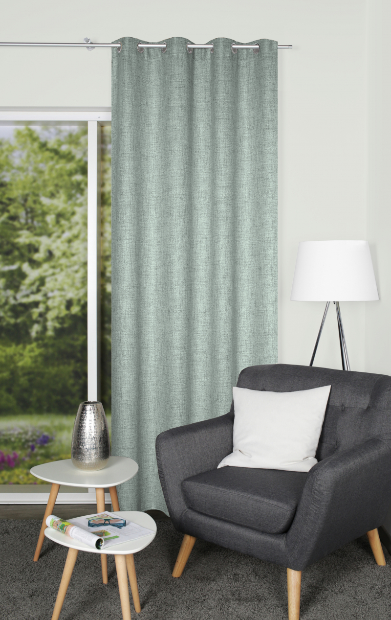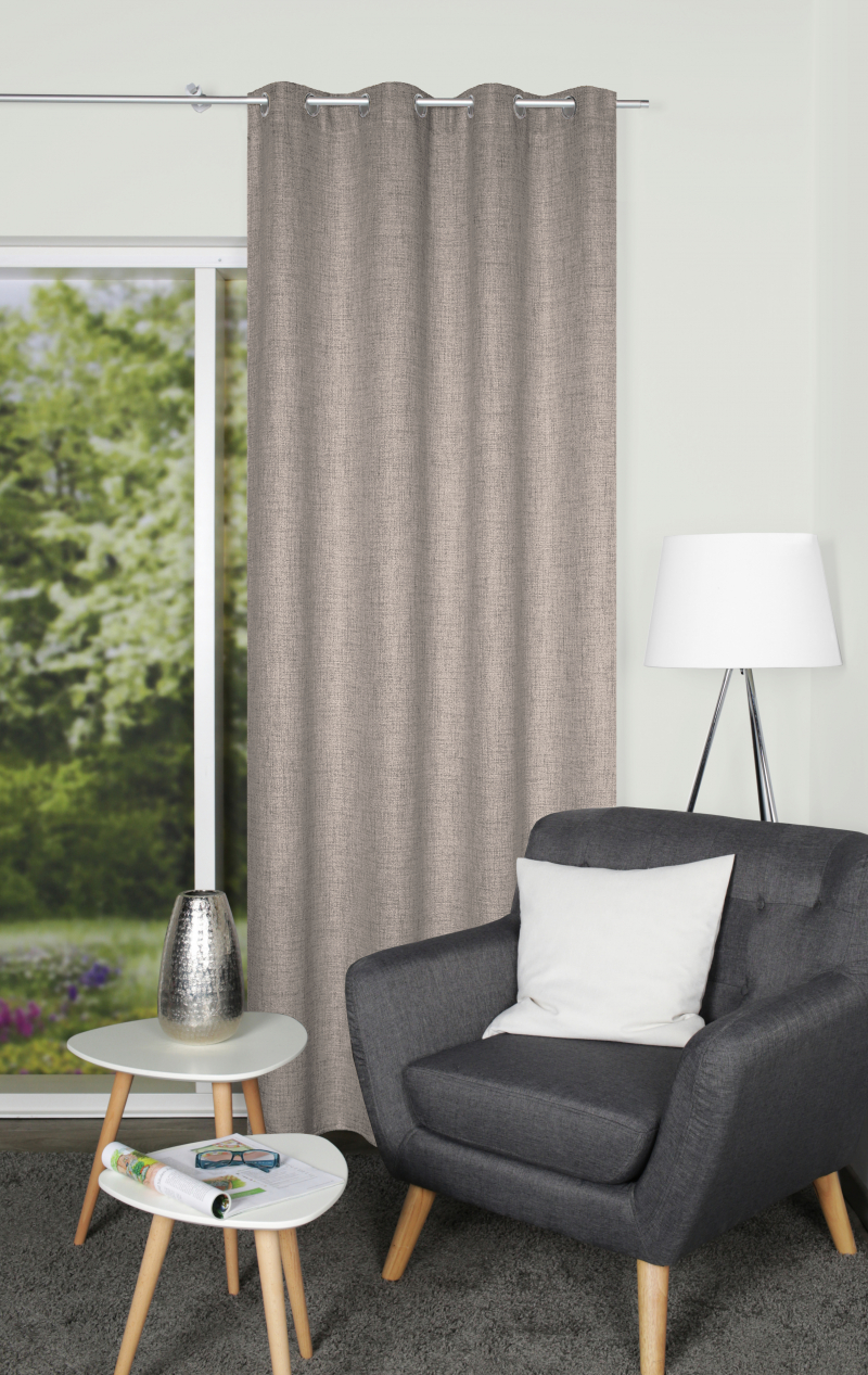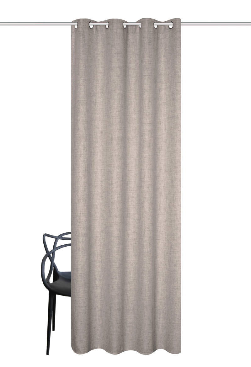 nepriehľadný dekoračný záves (nie je to blackout) s ľanovou štruktúrou zavesený prostredníctvom kovových krúžkov